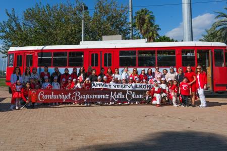 Cumhuriyet marşları eşliğinde bayraklar, balonlar ve süslerle donatılan tramvay kabininde minik yolcular, söyledikleri şarkılarla coşku dolu bir atmosfer oluşturdu. 32 ana sınıfı öğrencisi, ellerinde bayraklarla Cumhuriyet marşlarına eşlik ederek bayram sevincini doyasına yaşadı.